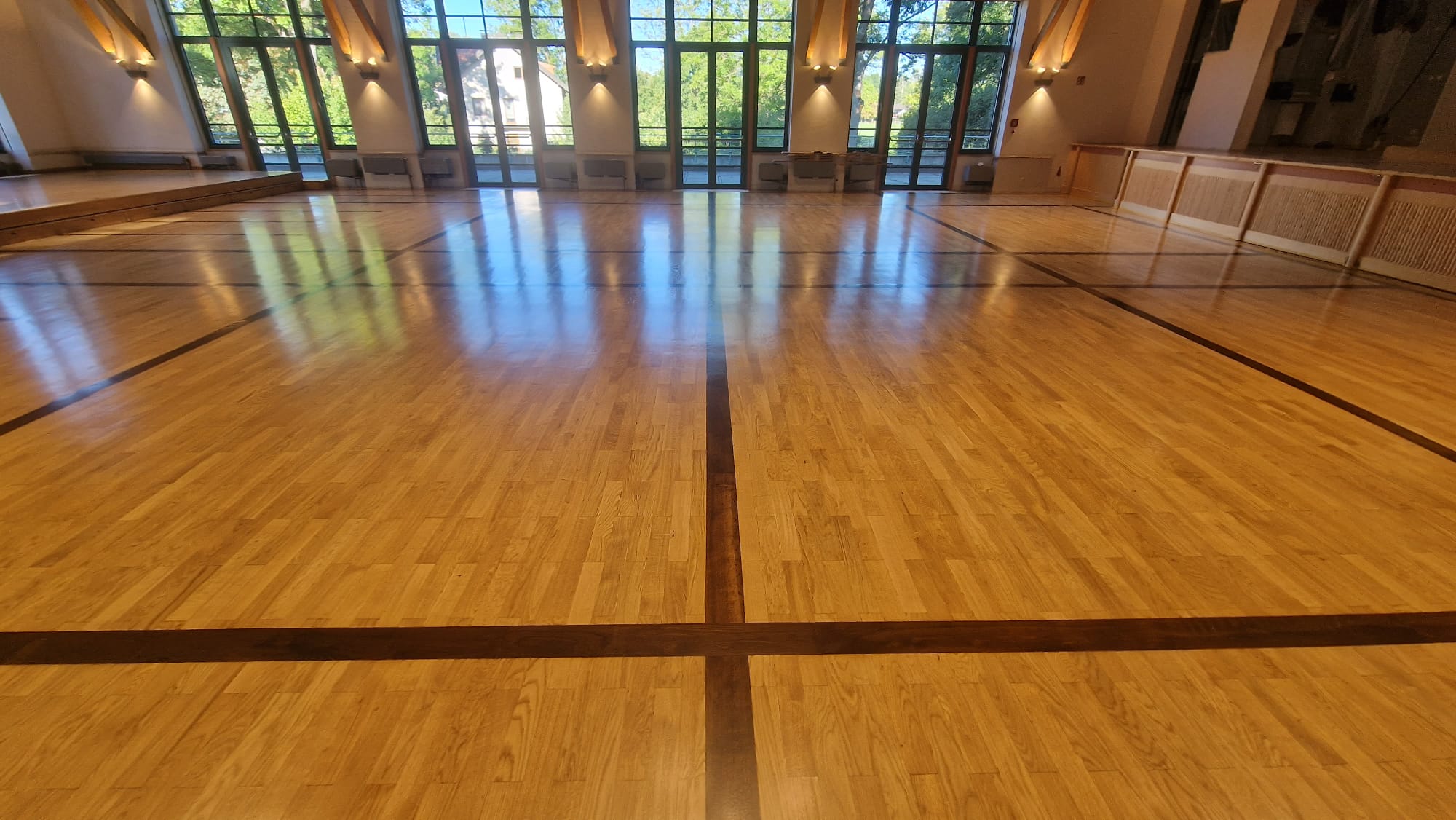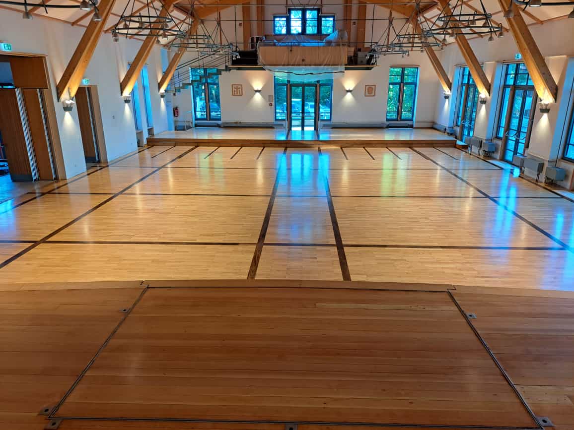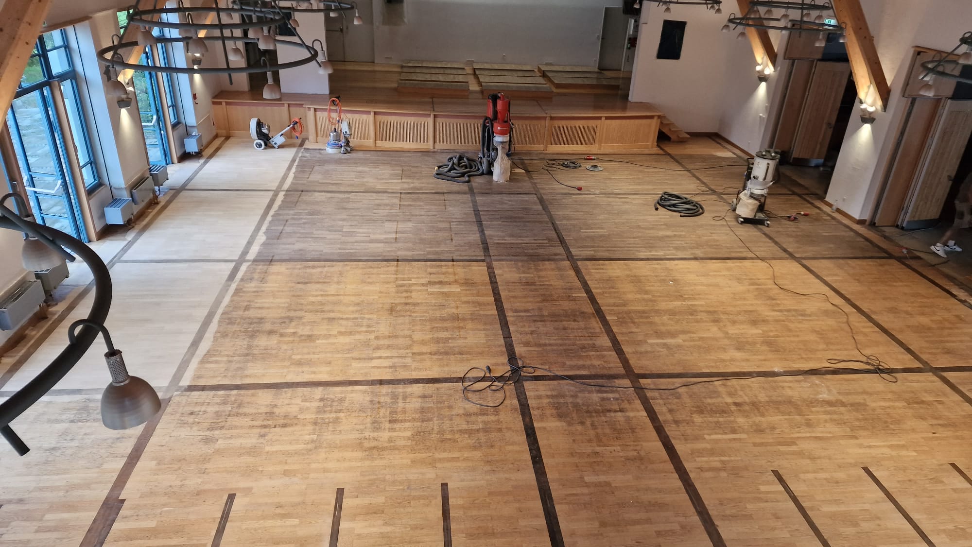 Zuerst wird mit unserer Walzenschleifmaschine der alte Lack und jegliche Kratzer ausgeschliffen. Hiermit gewinnt der Boden seine originale Optik wieder.